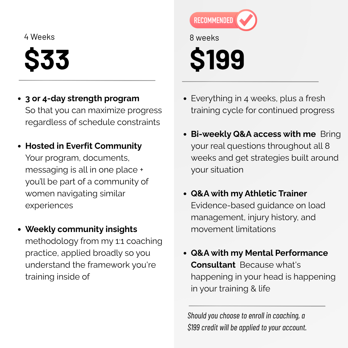 Each week inside the community, I drop methodology from my 1:1 coaching practice — applied broadly so you understand the framework, not just the workouts.
